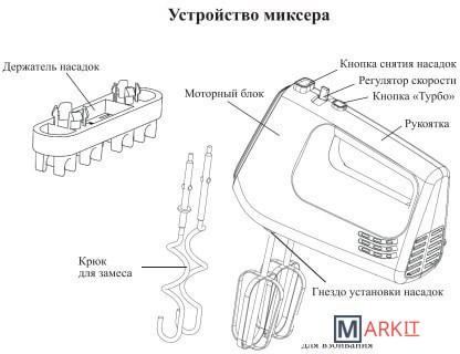 Класс защиты от поражения электрическим током: II;Материал корпуса: пластик;Материал насадок: хромированная сталь;Размеры: 195x95x145 мм;Вес: 0.8 кг.Комплектация:- миксер;- 2 венчика для взбивания;- 2 крюка для замеса;- держатель насадок;- руководство по эксплуатации.