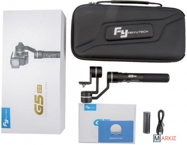 Комплектация - Электронный трёхосевой стедикам FY-G5GS для экшн-камер Sonу.- Аккумулятор.- Чехол для хранения.- USB кабели для подключения.- Оборудование для монтажа и подключения к компьютеру.